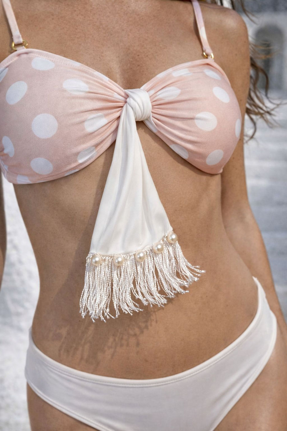 Pearl Fringe Polka Dot Bandeau Bikini Set