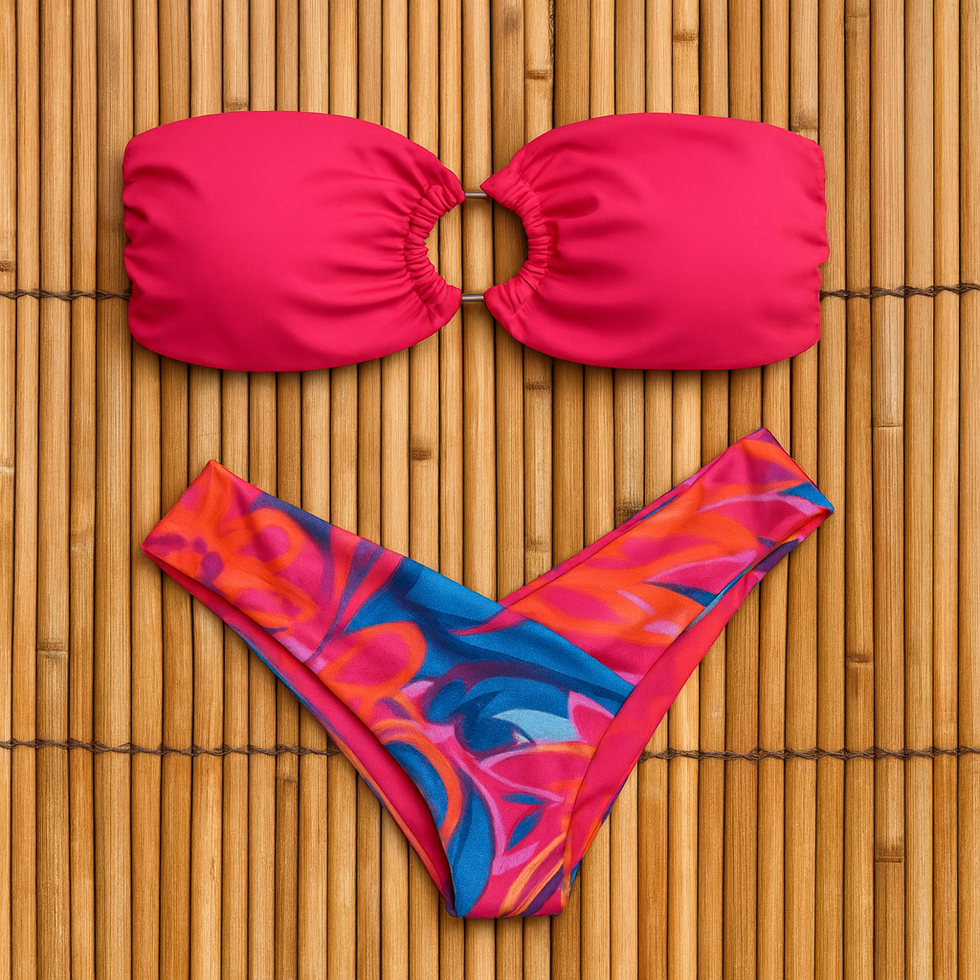 This stylish bandeau bikini set features a bold fuchsia top with a flattering central ring detail that enhances the silhouette while creating a modern and feminine shape. The high-cut bikini bottom showcases a vivid tropical print with warm sunset tones, bringing energy and sophistication to this luxury swimwear piece.